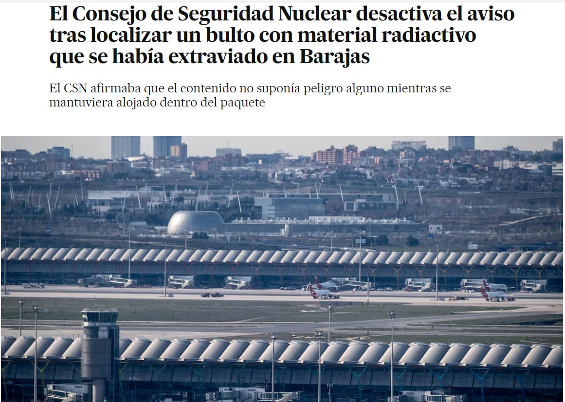 А вчора іспанська газета El Pais повідомила, що в аеропорту Мадрида зник контейнер з селеном-75, який використовується для рентгенографії. Однак інспектори виявили зникнення. Контейнер був неушкоджений, і витоку не сталося.