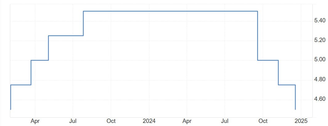 Федеральна резервна система США знизила ключову процентну ставку на 25 базисних пунктів, встановивши її в діапазоні 4,25-4,5%.