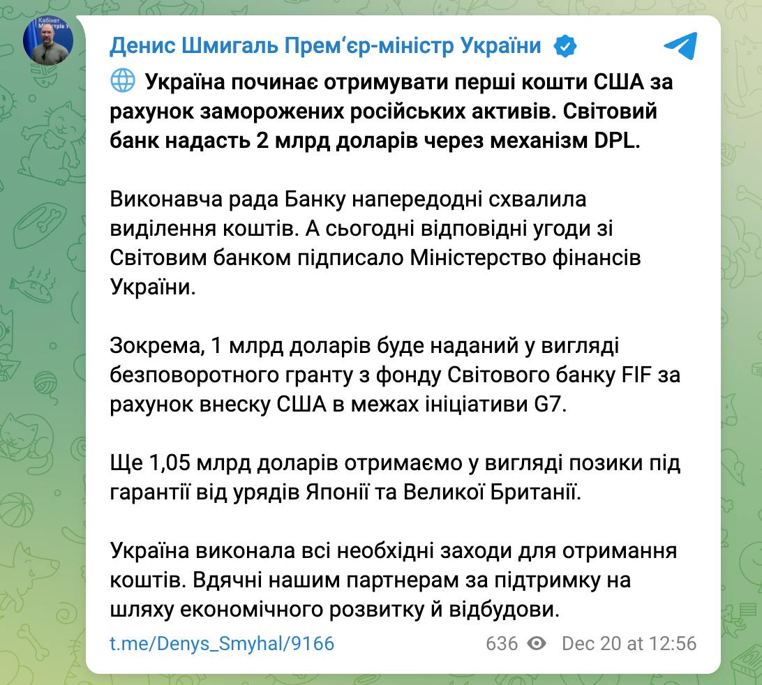Україна почала отримувати перші фінансові кошти із заморожених російських активів. Виконавча рада Світового банку схвалила виділення 2 мільярдів доларів через механізм підтримки політики розвитку (DPL), повідомив прем’єр-міністр України Денис Шмигаль.