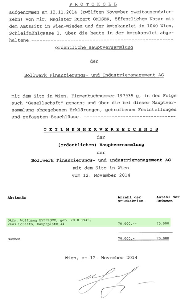 Единственным акционером компании Bollwerk, которая наживается на государственных активах Украине, является уже упомянутый ранее ... 70-летний австрийский пенсионер Вольфганг Айбергер из городка Лоретто. Тот самый, который управляет урановой прокладкой «Steuermann».