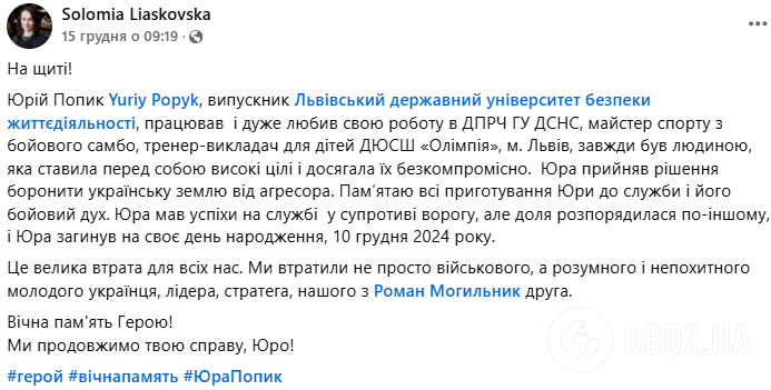У районі Костянтинівки Краматорського району Донецької області 11 грудня загинув воїн-доброволець Юрій Попик. 10 грудня Герой відзначив свій 34-й день народження.