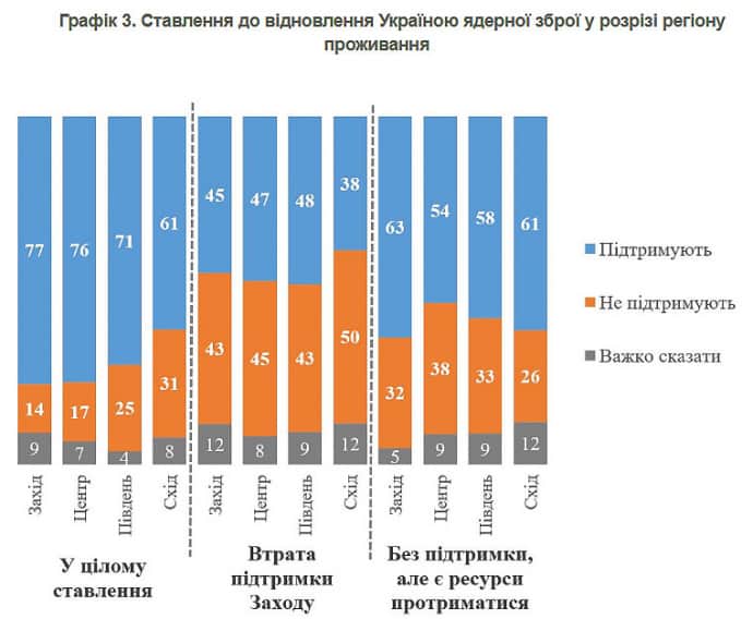 Соціологи акцентують, що у всіх регіонах більшість – від 61% на Сході до 77% на Заході – загалом прихильна до відновлення ядерної зброї.
