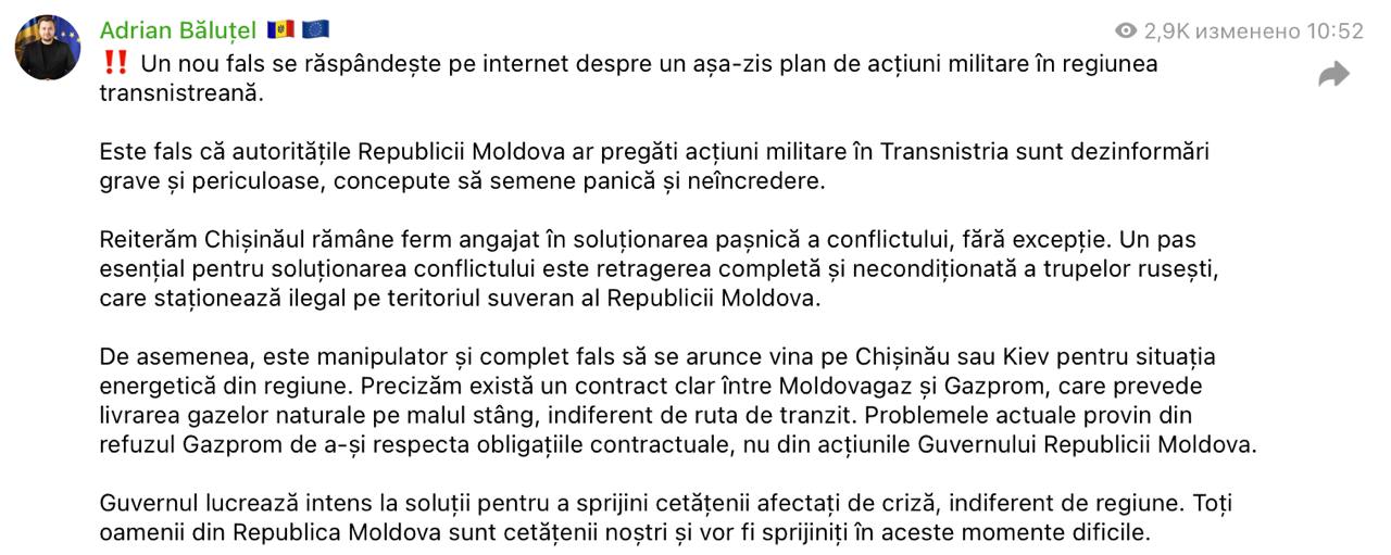"Це серйозна і небезпечна дезінформація, спрямована на створення паніки та недовіри. Ми підтверджуємо, що Кишинів залишається твердо налаштованим на мирне врегулювання конфлікту без винятків", - заявляє глава Адміністрації президента Молдови Адріан Балутель.