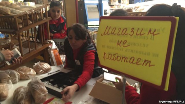 Магазины либо не работают вовсе, либо спасаются дизельными генераторами, либо с лотков продают самый ходовой нынче товар в Крыму – хлеб да свечи по 40 рублей за штуку.