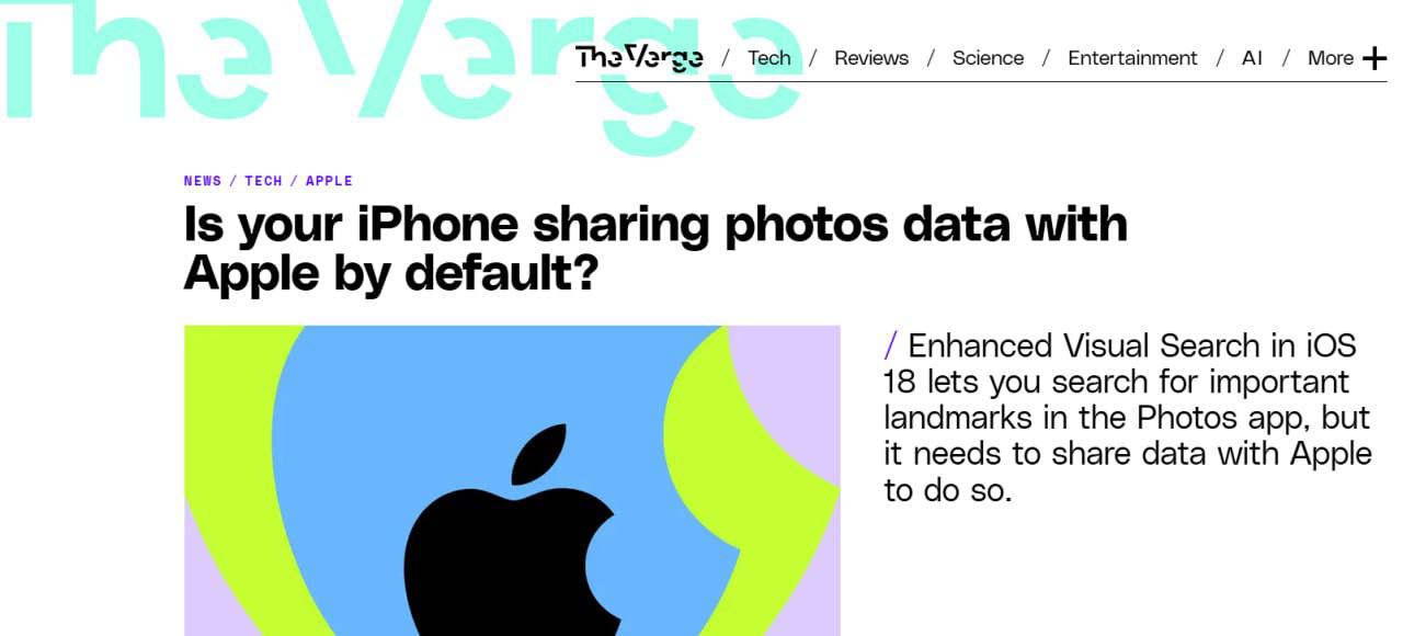 Apple аналізує особисті фотографії власників iPhone і зчитує геолокацію місця знімання, повідомляє The Verge.