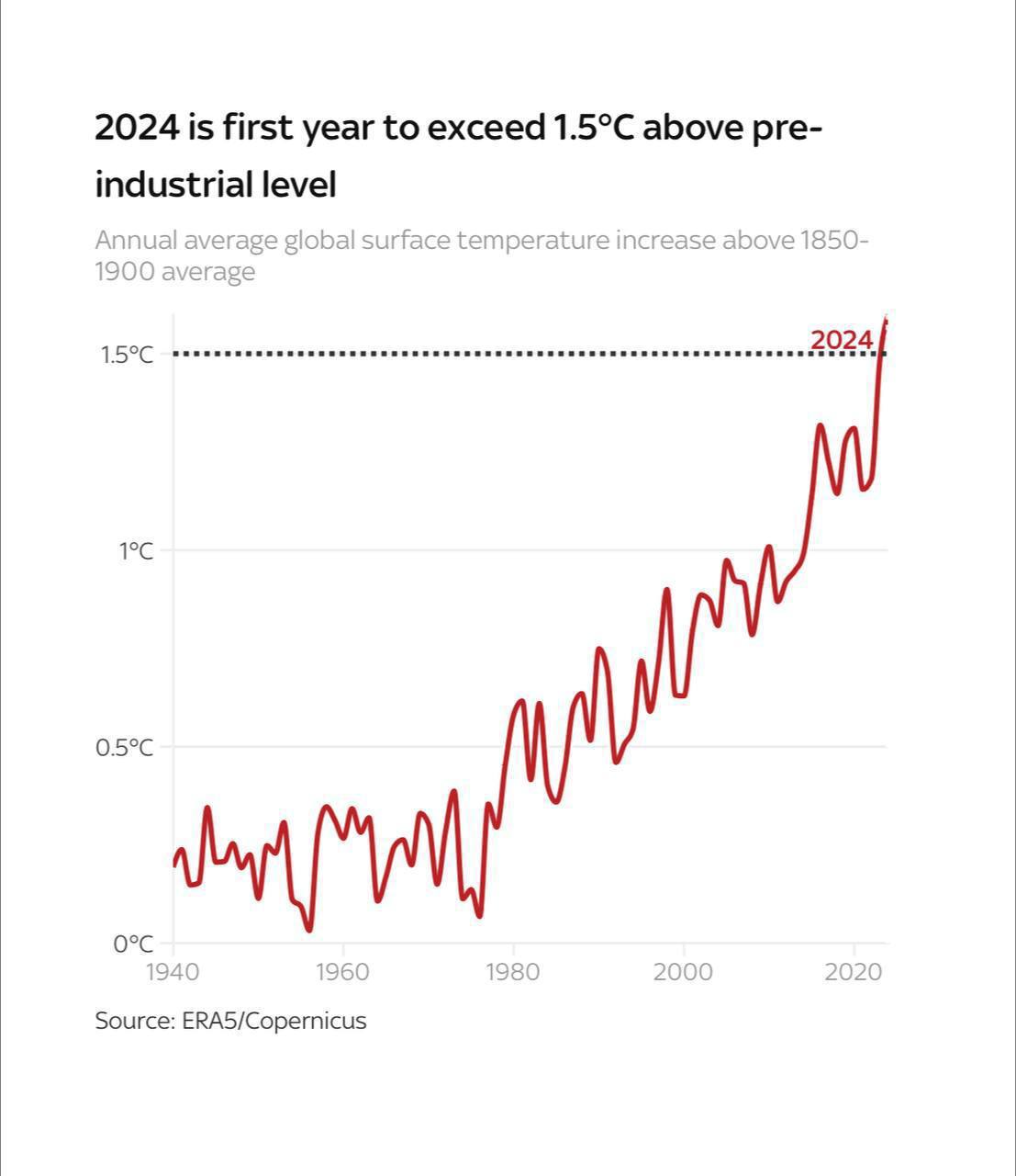 Згідно з даними, опублікованими кліматичною службою Copernicus, 2024 рік став найтеплішим за всю історію спостережень і першим, коли середня температура на планеті перевищила 1,5°C у порівнянні з доіндустріальним рівнем. Проте, довгострокові показники залишаються нижчими за цю позначку, хоча тренд на підвищення температури стає все очевиднішим.