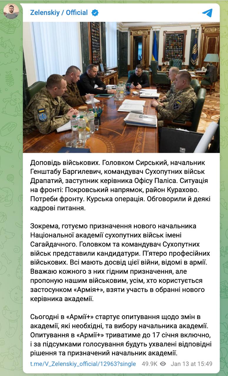 Президент України Володимир Зеленський повідомив, що новий начальник Нацакадемії сухопутних військ імені Сагайдачного буде обраний з запропонованих кандидатур військовими шляхом голосування на платформі "Армія+".