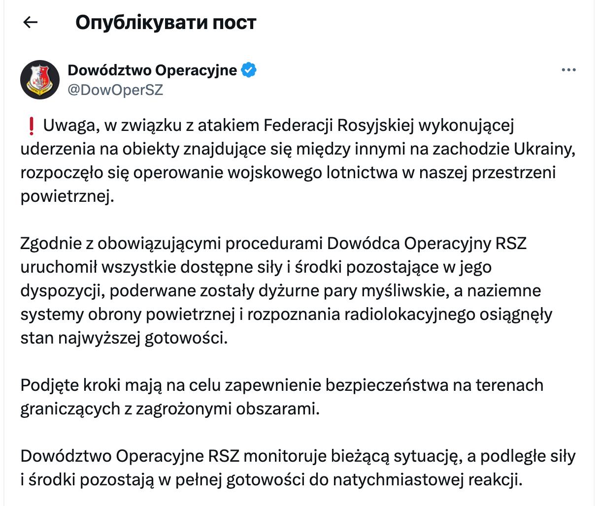 Про це повідомило Оперативне командування Збройних сил Польщі. Вказано, що залучено чергування бойових пар, а наземні системи протиповітряної оборони та радіолокаційної розвідки приведені у найвищий стан готовності.