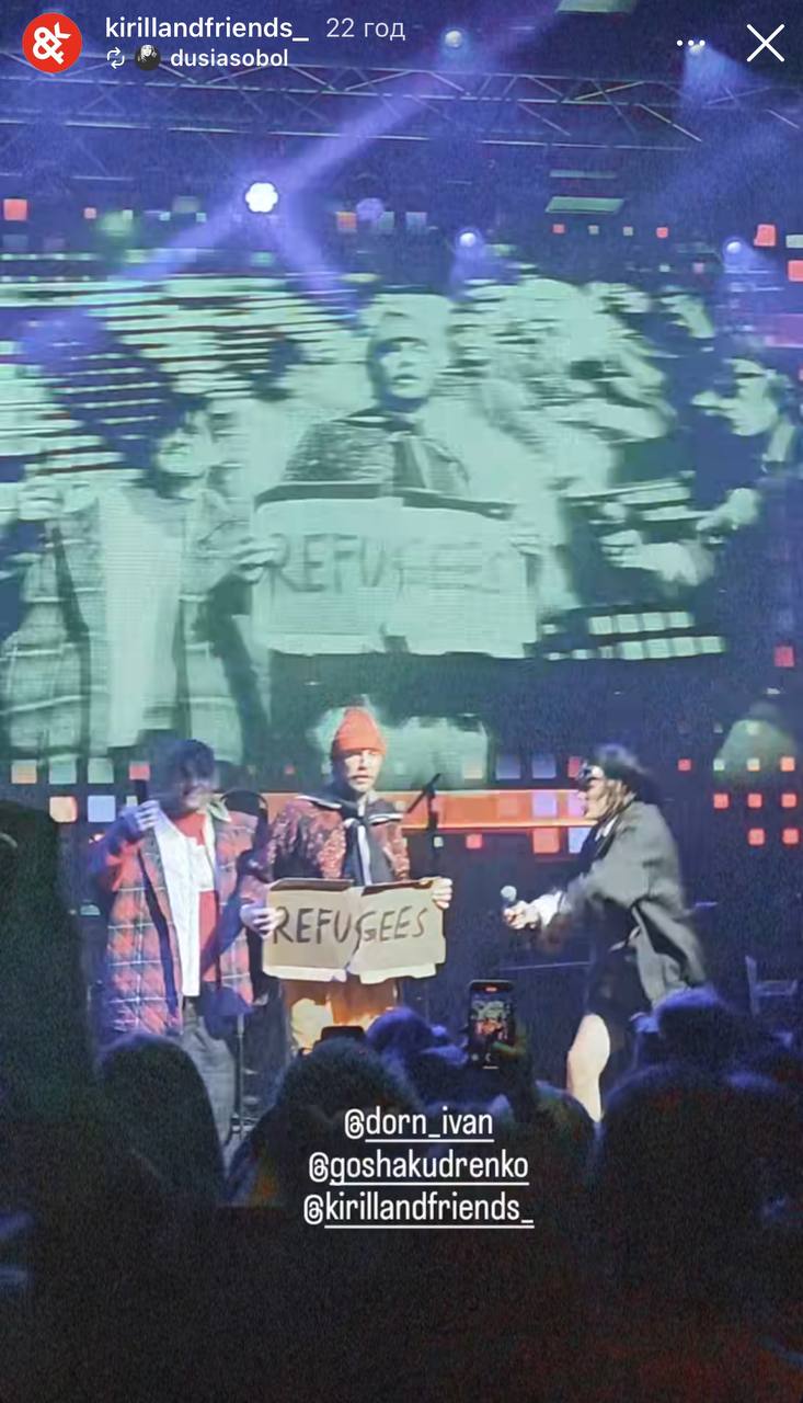 Виконавець з’явився на сцені з російськими акторами, тримаючи табличку "біженці" в руках. До гостей вечірки він звертався українською мовою.