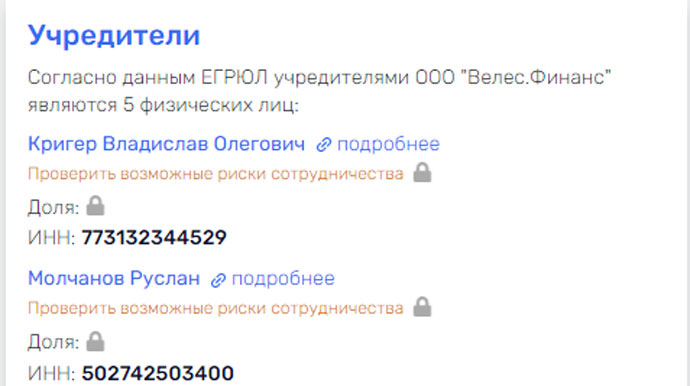 В розділі «Наша команда» на сайті veles.finance вказано керівництво компанії. Нас цікавлять вже згадані засновники Владислав Крігєр, Руслан Молчанов, а також виконавчий директор Євгенія Кузьміна.