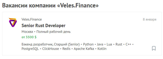 Із 8 січня цього року «Вєлєс.Фінанс» підшукує спеціаліста на посаду Senior Rust Developer на повний робочий день в офісі у Москві.