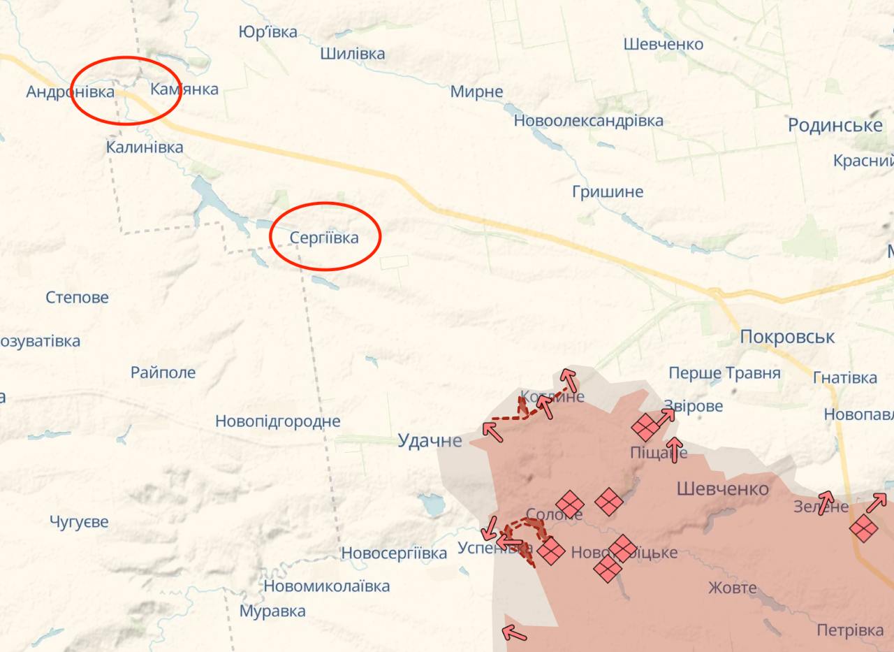 Російські війська перерізали залізничний шлях між Удачним і Котлиним і рухаються в напрямку Сергіївки, від якої до кордону Дніпропетровської області - приблизно 3 км. До цього населеного пункту вже долітають ФПВ-дрони.