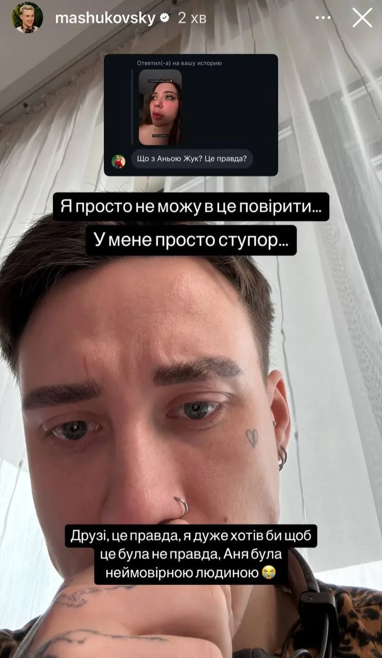 "У мене просто ступор. Друзі, це правда. Я дуже хотів би, щоб це була неправда. Аня була неймовірною людиною", – висловився Олег Машуковський.