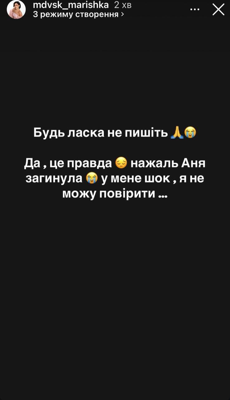 Не змогла стримати сліз і Анна Алхім. Спершу вона вийшла на зв’язок у розмовні stories, де із тремтячим голосом зазначила: сподіваюся, що інформація про загибель інтернет-діячки – це просто невдалий жарт. Однак вже за кілька хвилин написала: "Я не вірю. Ні, ні, ні. Аня..."