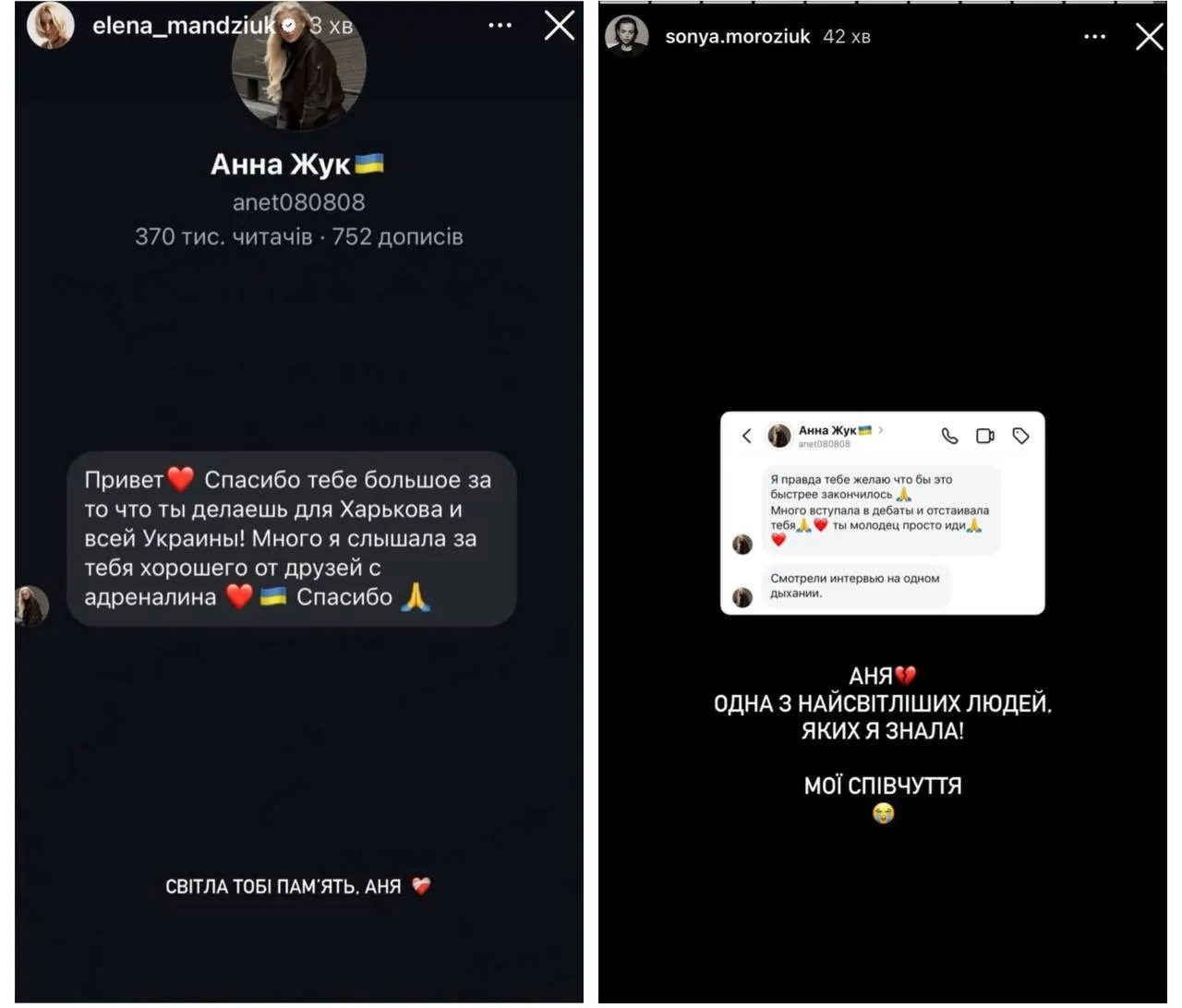 Аби вшанувати пам’ять Анни Жук, деякі інфлюенсери вирішили поділитися фрагментами особистих листувань, де можна побачити, що вона була доброю людиною. Так, наприклад, Соня Морозюк показала, що отримала підтримку від зірки мережі у складний життєвий період, а Олена Мандзюк оприлюднила повідомлення, де блогерка подякувала їй за все, що вона робить для України.