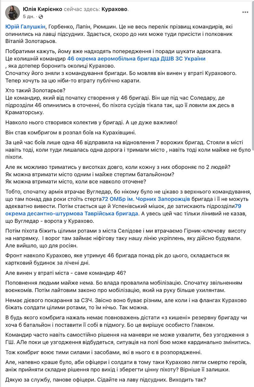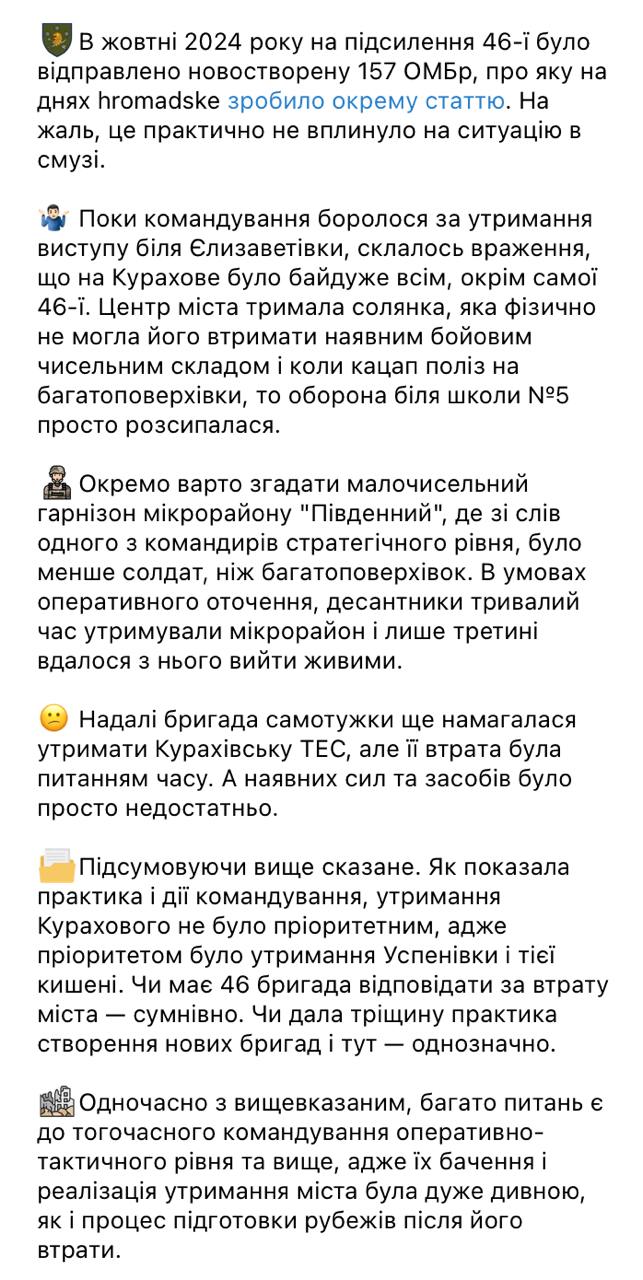 "Бригада залишалася в місті навіть тоді, коли туди вела лише одна дорога, і утримувала його, навіть коли піхоти майже не було. Але як можна захистити місто лише одним і майже розгромленим батальйоном? Фронт навколо Курахового рушиться, як картковий будинок, всього за кілька днів. Поповнення особовим складом майже немає. Але винним у втраті міста вважають саме командира 46-ї?" - пише Кирієнко-Меринова.