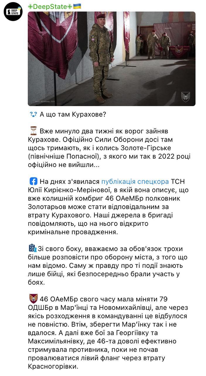 Проти колишнього командира 46-ї бригади Віталія Золотарьова порушили кримінальну справу за втрату Курахового (хоча це офіційно так і не було підтверджено), повідомляє військовий паблік Deep State та спецкор ТСН Юлія Кирієнко-Меринова.