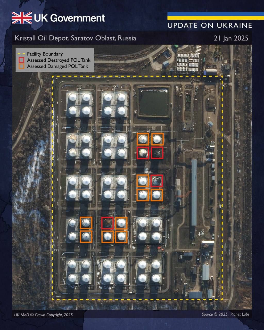 Аналіз супутникових знімків від 21 січня вказує на те, що внаслідок атак було знищено 4 цистерни з паливом і ще 10 пошкоджено.