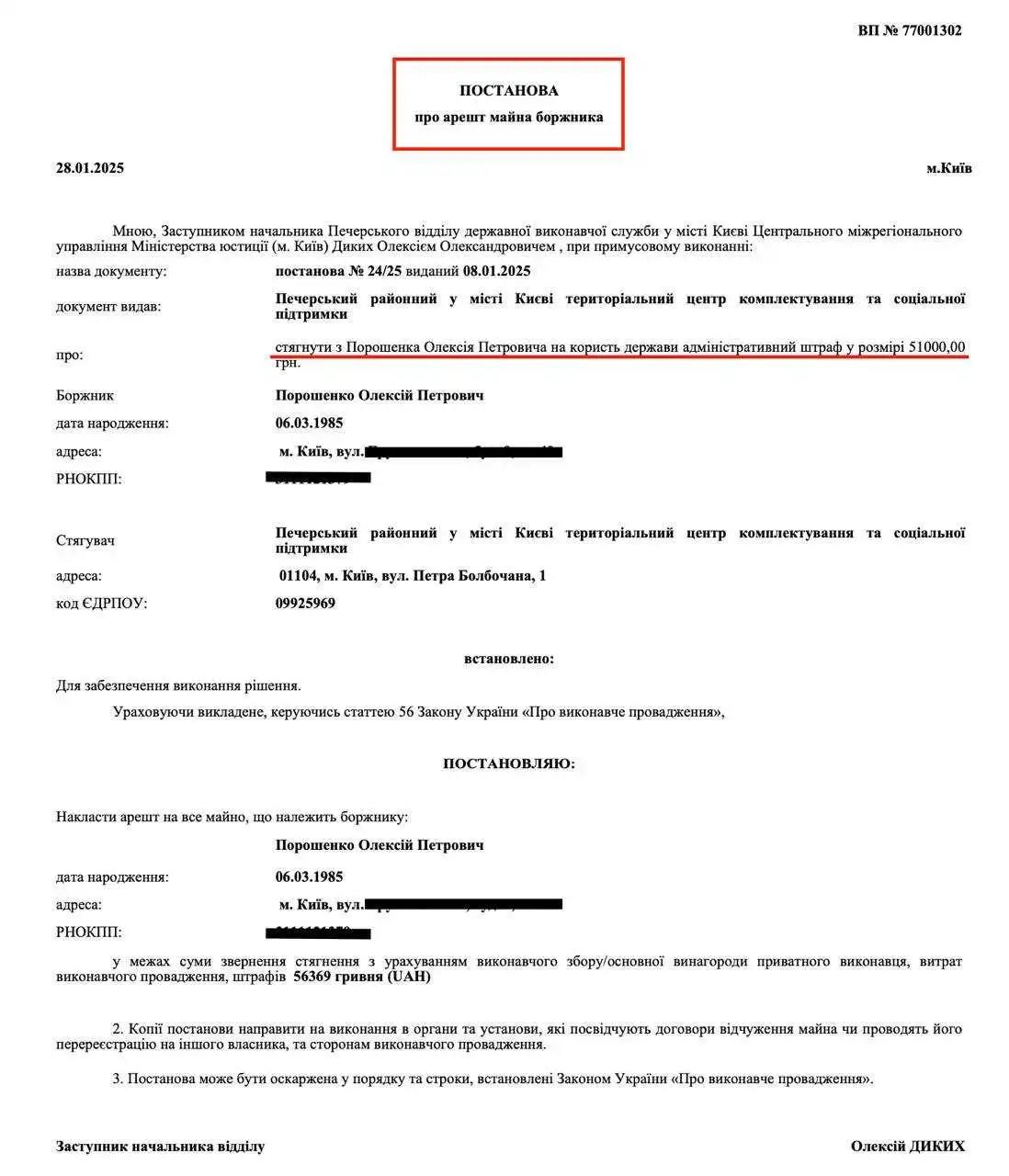 На майно сина Порошенка, Олексія, було накладено арешт, оскільки він не сплатив штраф у розмірі 56 тис. грн за ухилення від служби, як випливає з постанови, опублікованої в ЗМІ.