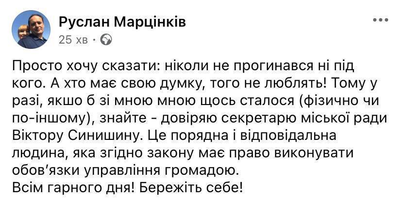 Спочатку Марцінків зазначив, що «якщо зі мною щось станеться (фізично або іншим чином), знайте – довіряю секретарю міської ради Віктору Синишину».