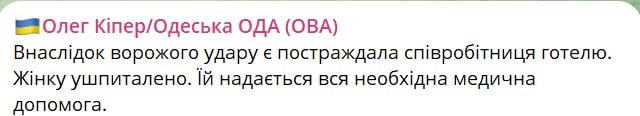 Як повідомив голова ОВА Кіпер, при ракетному ударі по центру Одеси була поранена співробітниця готелю.