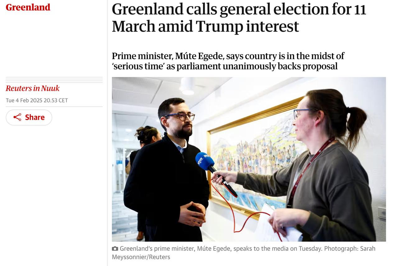 На 11 березня Гренландія призначила позачергові загальні вибори після заяв Трампа про намір придбати острів, передає The Guardian.