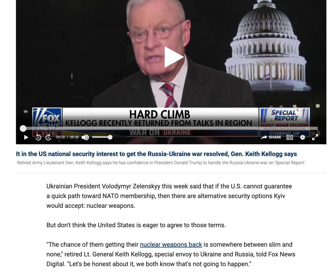 Кіт Келлог, спеціальний представник Президента США Дональда Трампа, заявив, що ймовірність повернення ядерної зброї Україні практично відсутня. Так він прокоментував заяву Президента Володимира Зеленського, який припустив, що якщо США не забезпечать вступ України до НАТО, Київ може розглянути можливість ядерного озброєння як альтернативу.