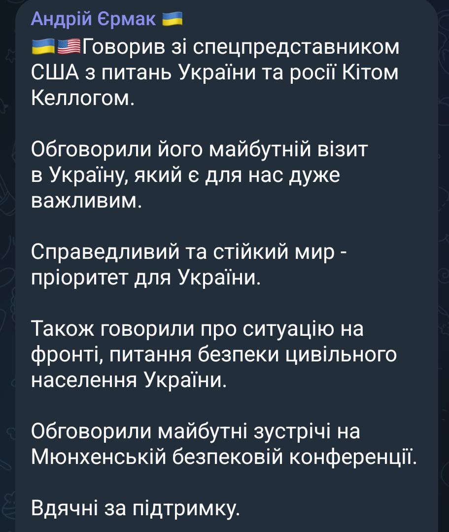 Також сторони торкнулися актуальної ситуації на фронті та майбутніх зустрічей на Мюнхенській конференції, куди Келлог також приїде.