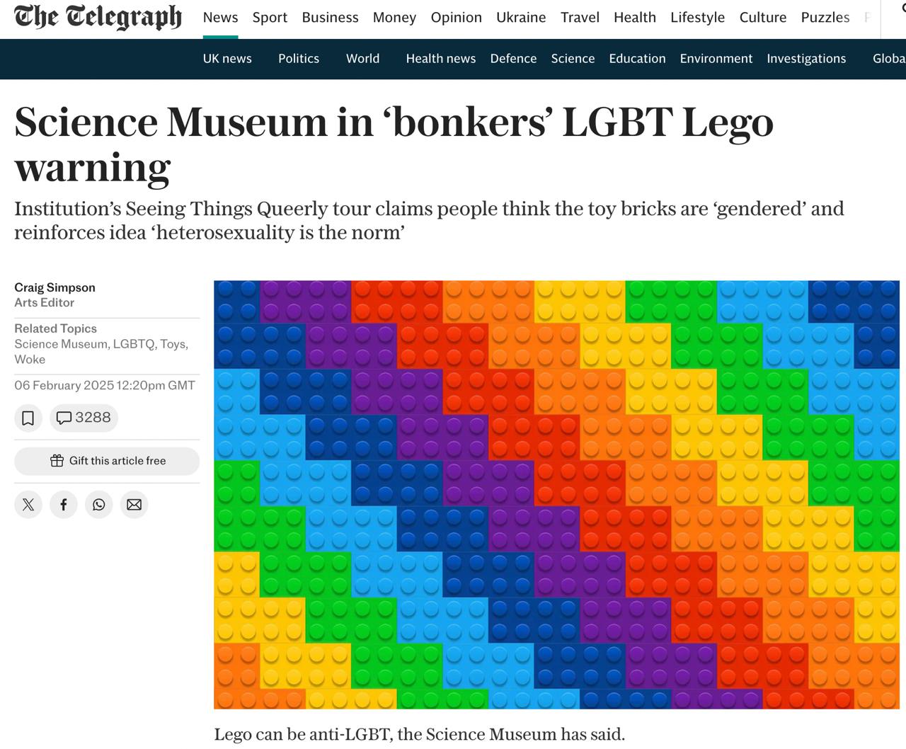 Британський Музей науки висловив занепокоєння з приводу конструктора "Лего", стверджуючи, що він сприяє поширенню гомофобних стереотипів.