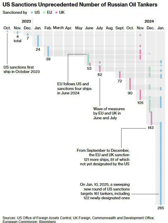 Під обмежувальні заходи США, ЄС та Великої Британії підпадають 265 танкерів, а придбання нових суден стає ризикованішим через ймовірність запровадження додаткових санкцій.
