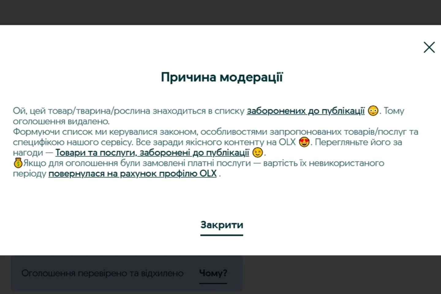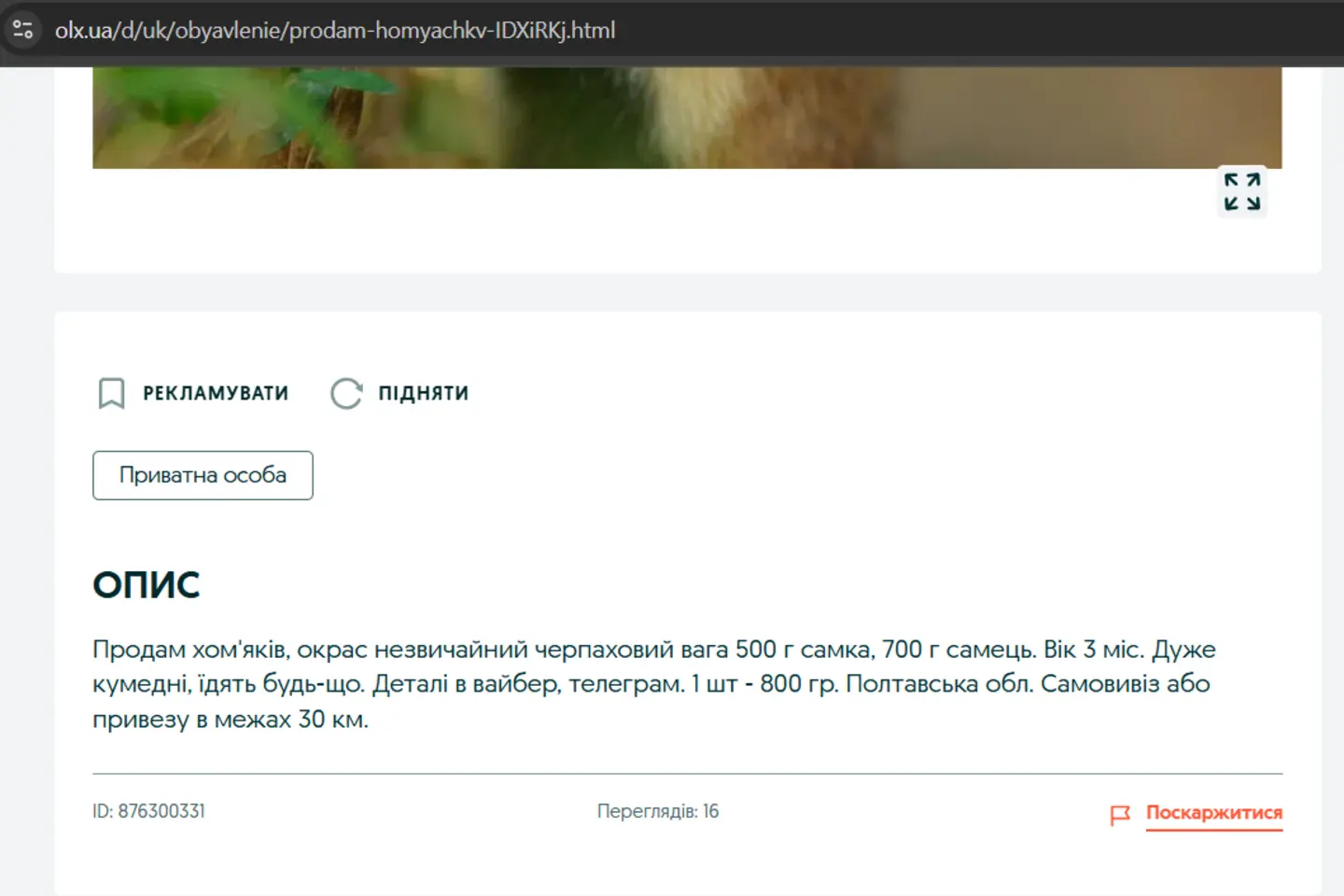 «Продам хом’яків диких європейських». Таке оголошення я залишила на olx. Обіцяла здорових і активних самця й самицю. Хом’як європейський — тварина з Червоної книги, тому просила мінімум по 800 гривень «за штуку». Пів дня оголошення чекало на модерацію, а ввечері його відхилили. Цей товар був у переліку заборонених до публікації.