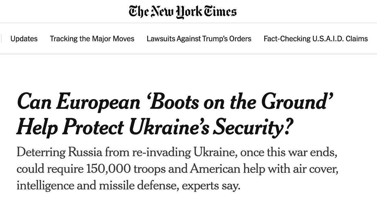 "Поки вступ України в НАТО залишається малоймовірним протягом багатьох років, розміщення значної кількості європейських військ з країн НАТО здається багатьом чиновникам і аналітикам нерозумним. Без явної американської участі в такій операції — включаючи повітряне прикриття, засоби ППО і розвідку, як людську, так і технічну — європейські війська будуть під серйозною загрозою з боку Росії", — пише NYT.