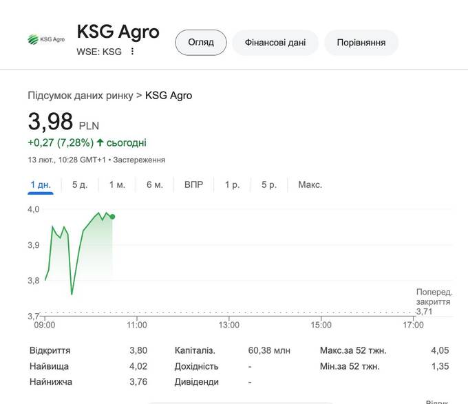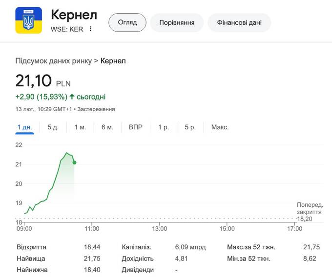 Крім того, акції KSG Agro подорожчали на 4,85%, а найбільшого виробника олії "Кернел" – на 7,91%.