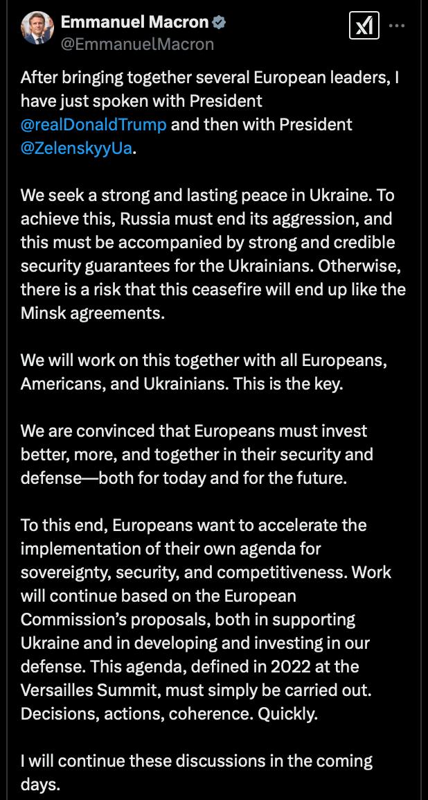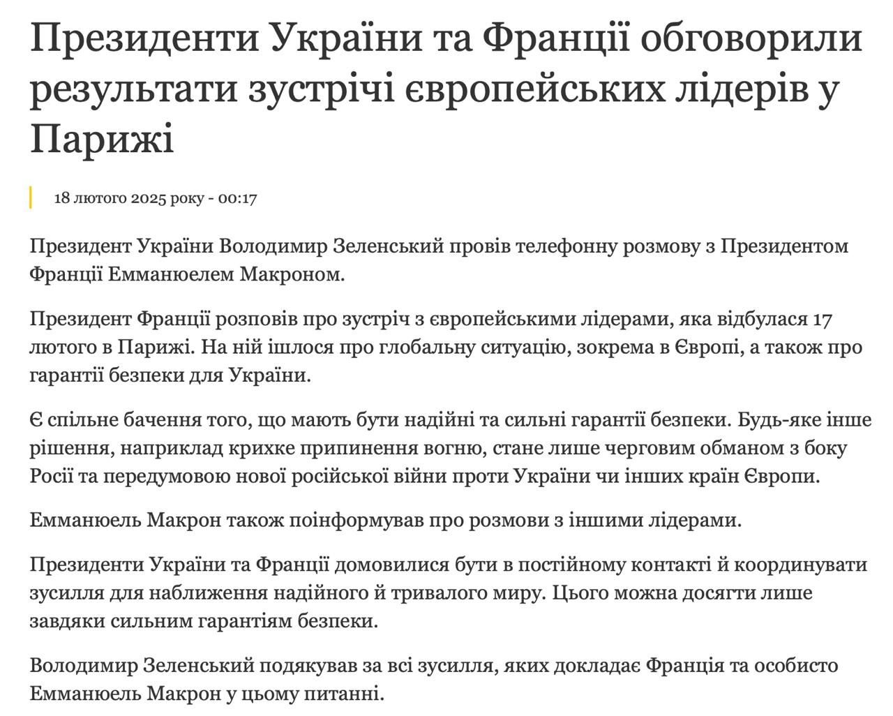 У розмові з Володимиром Зеленським і Дональдом Трампом Макрон також не напрацював нових рішень. Зеленський висловив побоювання, що будь-які слабкі угоди, такі як припинення вогню, призведуть до нового вторгнення Росії.
