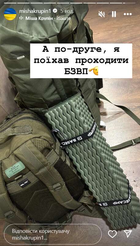 Про початок військового тренінгу Міша Крупін повідомив у своєму Instagram, опублікувавши фото з підписом: "Ну що ж, тепер служу нашому народу. Приймаю ваші вітання!" У InstaStories він також поділився знімком військового спорядження, написавши: "Я поїхав проходити БЗВП".