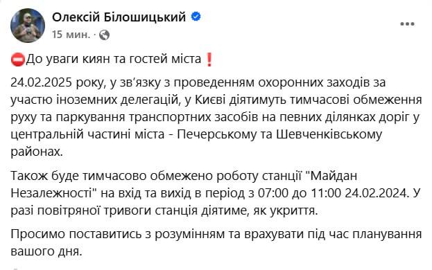 Повідомляється, що такі обмеження запроваджуються 24 лютого у зв’язку з проведенням охоронних заходів за участю іноземних делегацій.
