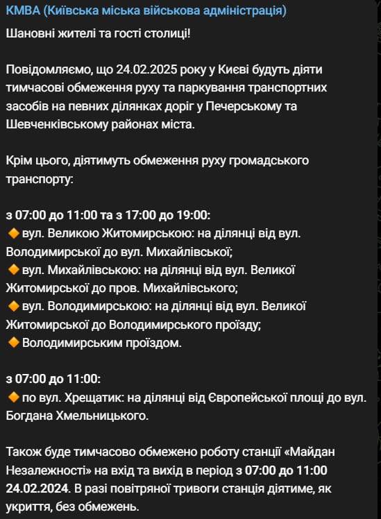 У Київській міській військовій адміністрації (КМВА), повідомили, що тимчасові обмеження руху та паркування транспортних засобів 24 лютого будуть встановлені "на певних ділянках доріг у Печерському та Шевченківському районах міста".