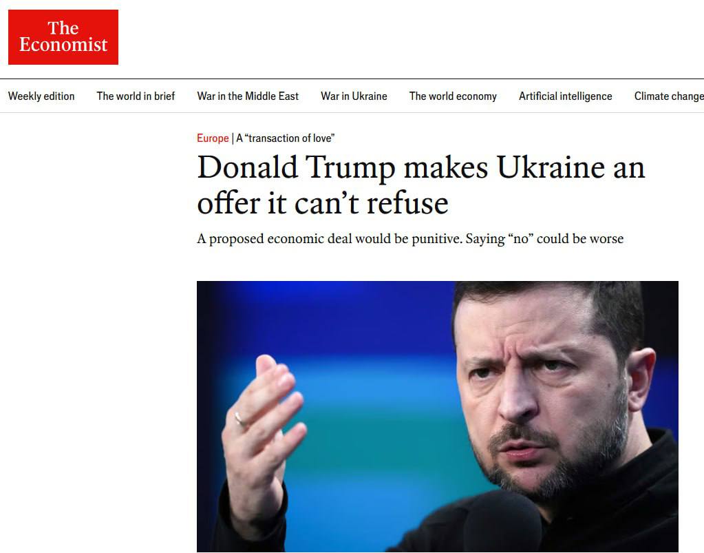 За даними The Economist, адміністрація Дональда Трампа пропонує Україні угоду, яка передбачає використання природних ресурсів країни в обмін на фінансову та військову підтримку.