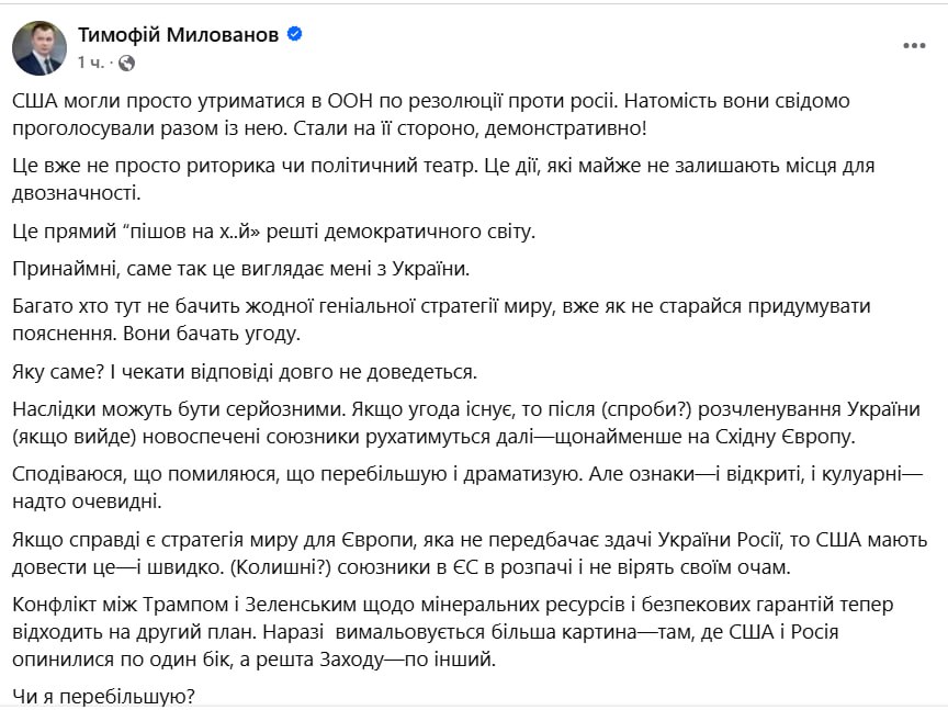 «США могли б просто утриматися від голосування в ООН щодо резолюції проти Росії. Однак вони навмисно проголосували разом з нею. Виступили на її боці, демонстративно! Це не просто слова або політичний театр. Це дії, що практично не залишають місця для двозначностей. Це пряме “пішов на х@й” решті демократичного світу», – написав Милованов.