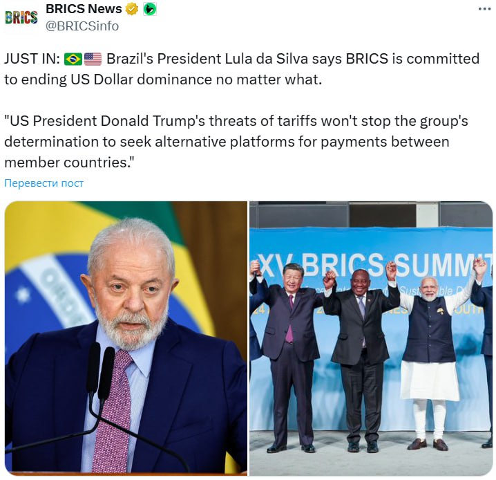 «Погрози введення мит, озвучені президентом США Дональдом Трампом, не завадять групі шукати інші платформи для розрахунків між державами-учасниками», – підкреслив Лула.