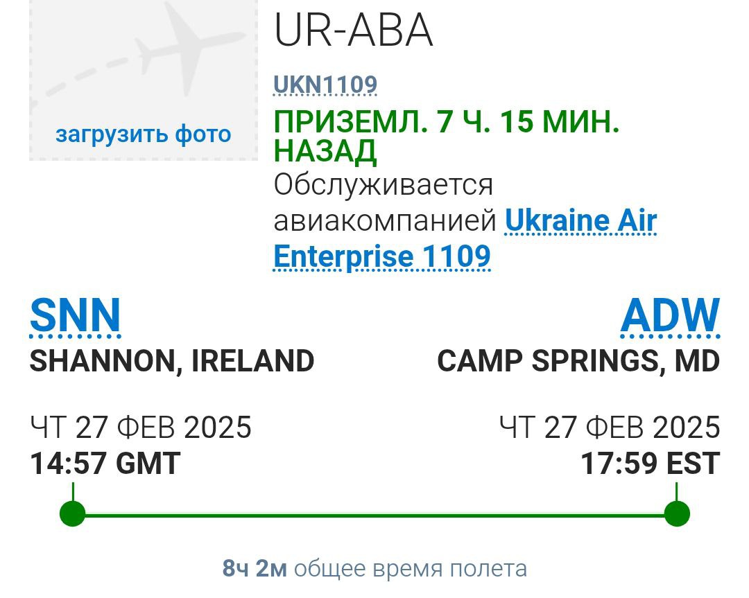 Президентський літак A319 вирушив з аеропорту "Шеннон в Ірландії та приземлився у штаті Меріленд приблизно о першій годині ночі за київським часом.