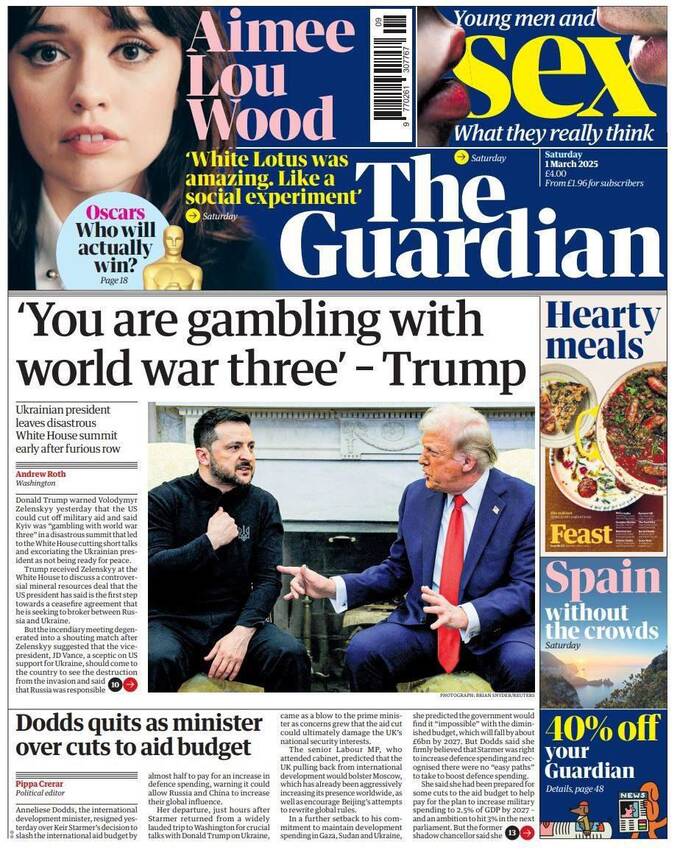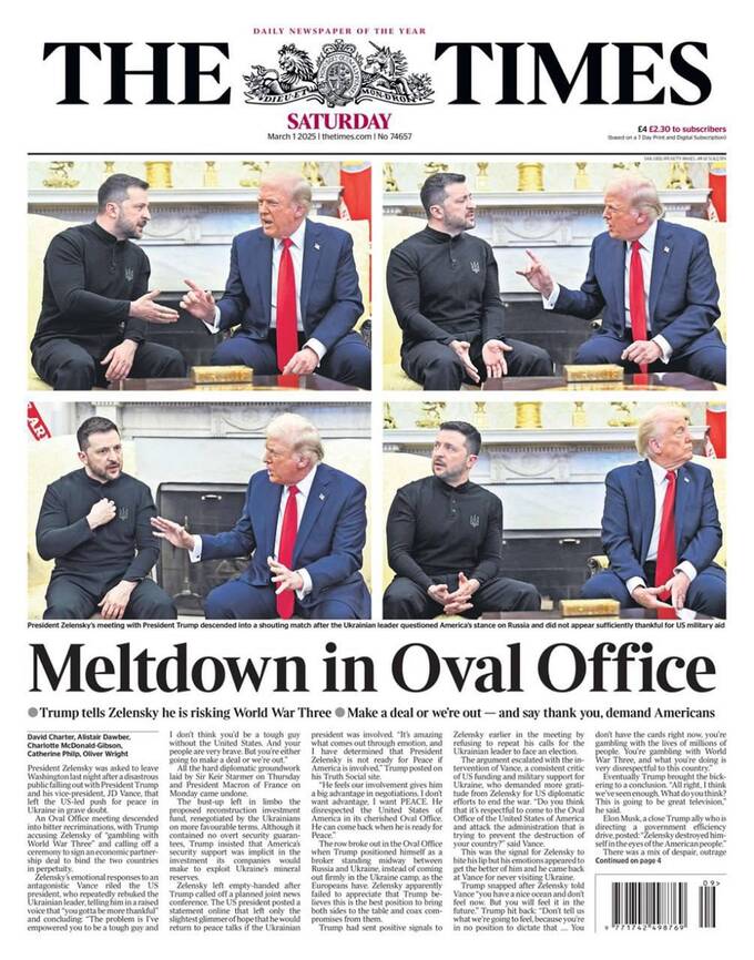 Перші шпальти світових онлайн-видань рясніють фотографіями із зустрічі президентів США та України — Дональда Трампа та Володимира Зеленського, де між ними сталася суперечка за участі також віцепрезидента США Венса. Кореспонденти діляться враженнями, що були шоковані й ще не бачили подібного в Білому домі, а ця словесна суперечка між Трампом і Зеленським — надзвичайна подія у світі дипломатії.