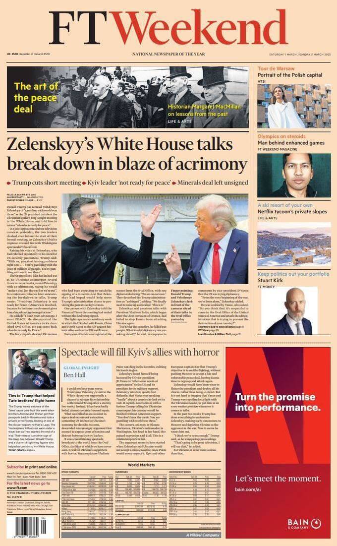 "Зустріч Трампа і Зеленського зривається, загрожуючи надії на мир" — під таким заголовком опублікований матеріал на головній сторінці The Wall Street Journal. Редколегія WSJ також опублікувала колонку. На думку редакції, в цій "виставі" в Овальному кабінеті 28 лютого переміг лідер Кремля Володимир Путін: "Віцепрезидент Венс починає публічну боротьбу, яка лише допомагає російському диктатору".