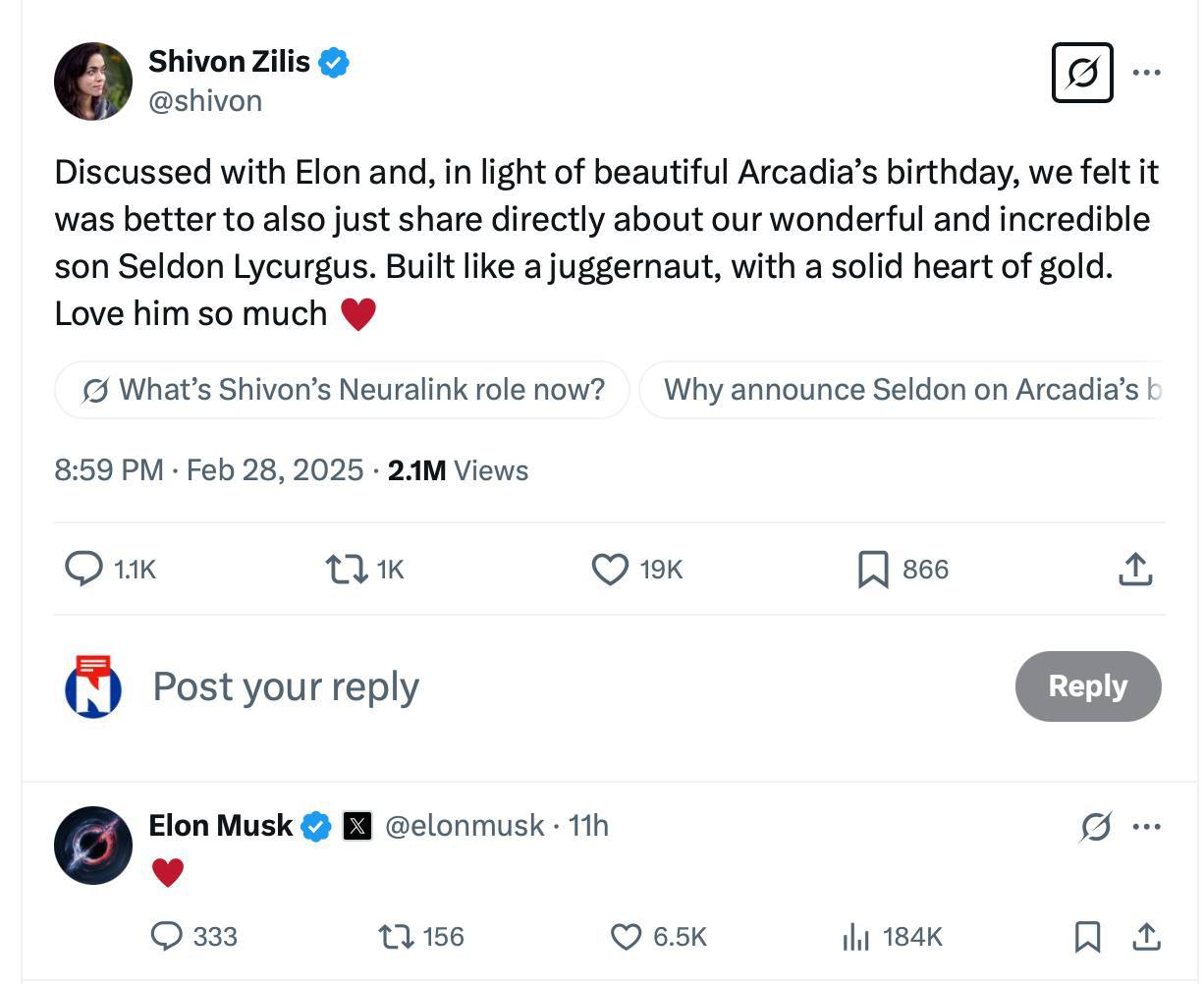 У багатодітного батька Ілона Маска — поповнення в родині. Топменеджерка компанії Neuralink Шивон Зіліс оголосила, що стала матір’ю четвертої дитини від Маска. Малюка назвали Селдон Лікург.