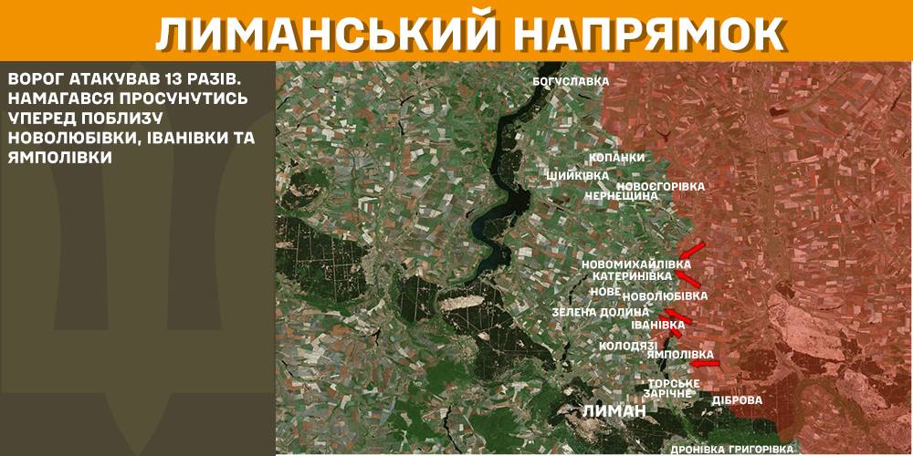 На Лиманському напрямку ворог атакував 13 разів - намагався просунутись уперед поблизу Новолюбівки, Іванівки та Ямполівки.