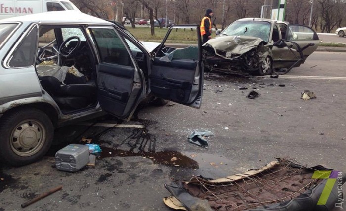 Сегодня днем в Одессе на улице Грушевского случилось смертельное ДТП. Автомобиль «Дэу Ланос», двигаясь в сторону автовокзала, выехал на встречку и совершил лобовое столкновение с машиной «Тойота Карина».