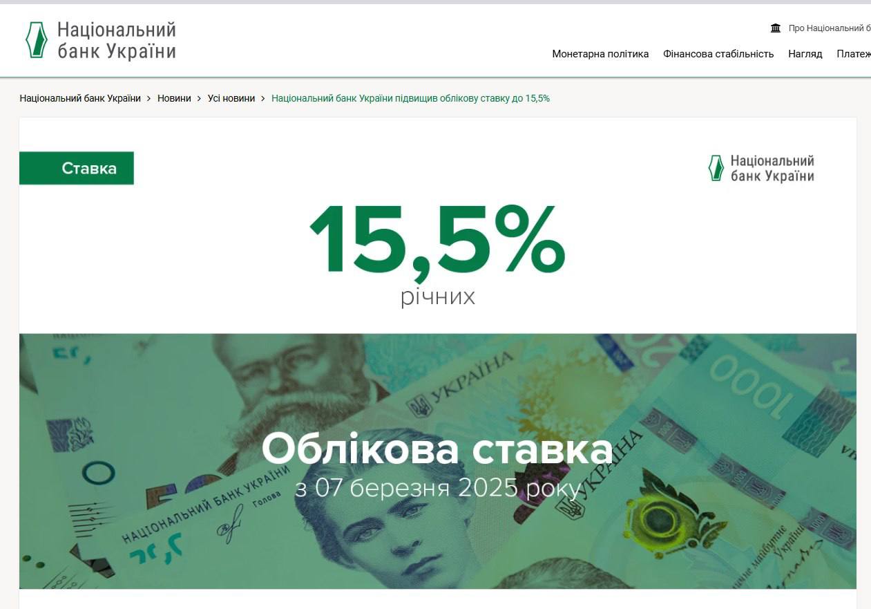 З 7 березня 2025 року Нацбанк підняв облікову ставку з 14,5% до 15,5% річних, повідомив голова НБУ Андрій Пишний.