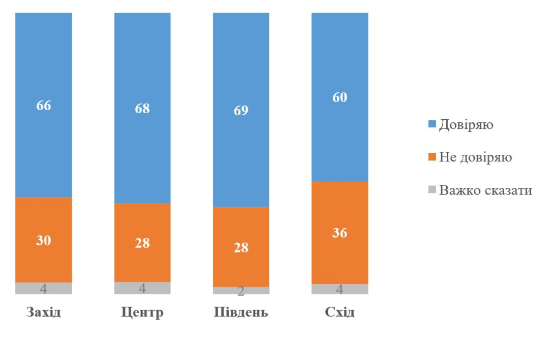 Опитування показало, що довіра до президента трохи нижча на сході України, але навіть у цьому регіоні більшість довіряють Володимиру Зеленському – 60% довіряють і 36% не довіряють. В інших регіонах 66-69% довіряють і 28-30% не довіряють йому.