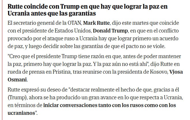 Генеральний секретар НАТО Марк Рютте заявив, що згоден з президентом США Дональдом Трампом у тому, що гарантії безпеки для України повинні прийматися після досягнення мирної угоди.