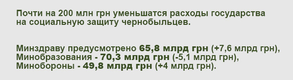 Например, из бюджета исчезла строка медицинско-санитарного обеспечения и лечения онкобольных чернобыльцев. Не предусмотрена компенсация бизнесу за призванных в армию сотрудников.